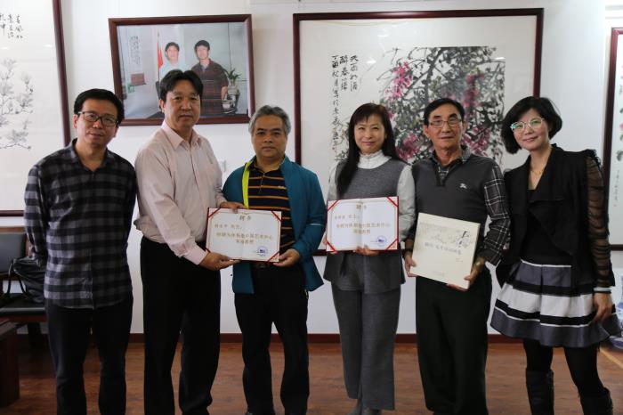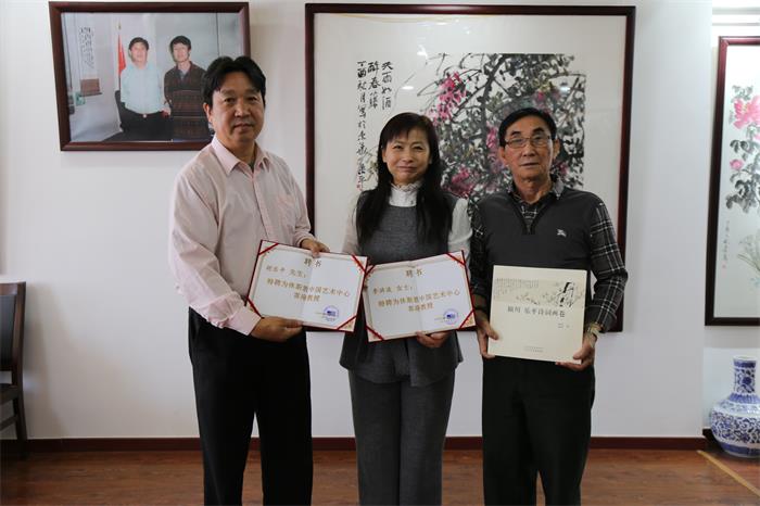 王丞栗老先生,吴董事长为李洪波院长、胡乐平教授颁发了美国休斯敦中国艺术中心客座教授聘书,李洪波就“张大千国际书画展”与外宾交换了意见,计划组织中国画家参加画展,弘扬大千艺术。李洪波院长从组织画家笔会到热衷公益,站在国家的角度推崇中国艺术,并不断为世界人民带来一个质的升华,为此李院长付出了常人难于付出的心血,得到了社会各界的好评,爱我中华,为国添彩。