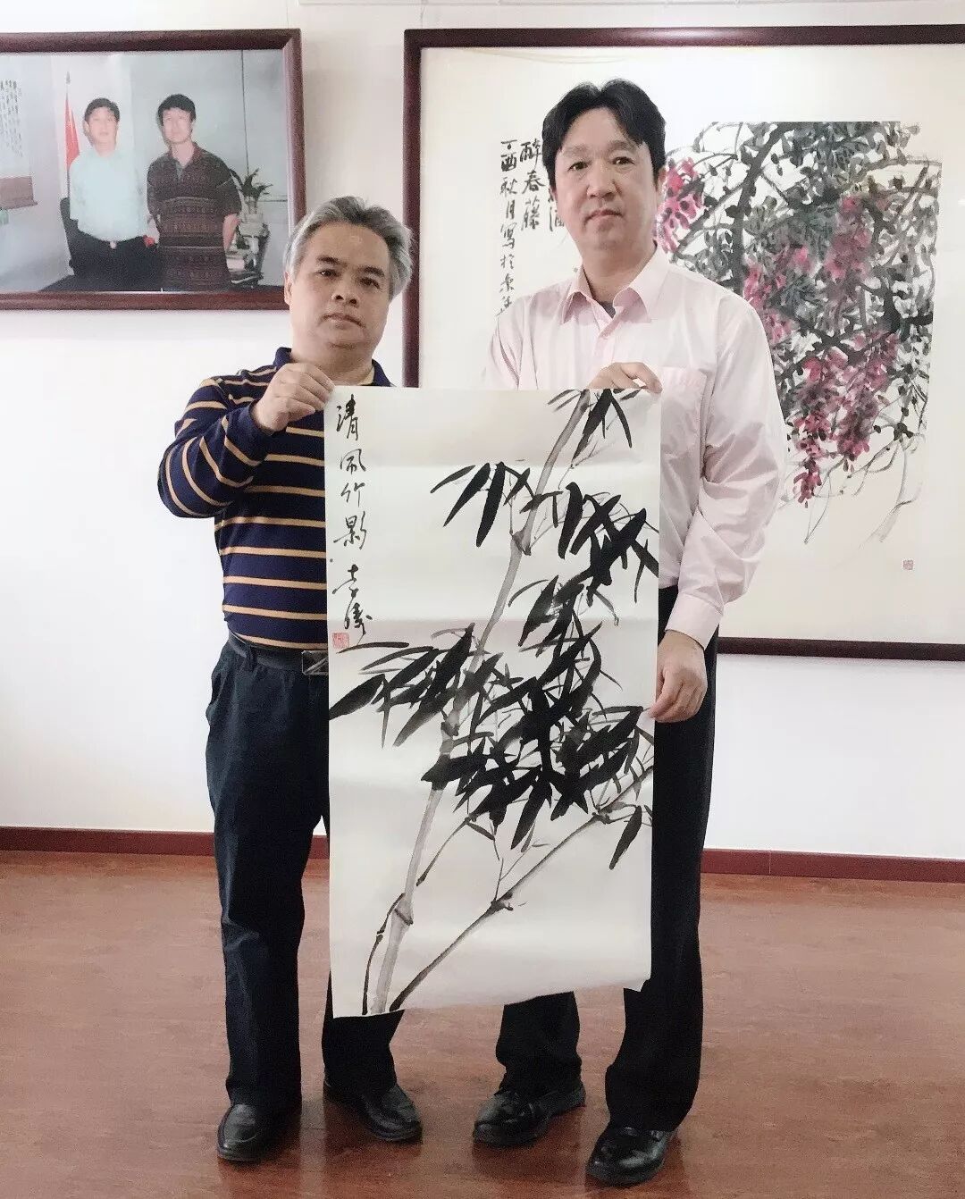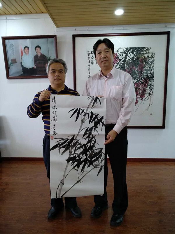 李涛画家现场为美国朋友写竹画荷,吴先生看出画风有吴昌硕风格,喜欢传统水墨画。这时李院长不无自豪地说“我们这里的画家都是精挑细选出来的,尤其是具有爱心,热衷公益,充满正能量的画家”。王丞栗会长,吴董事深表赞同,纷纷与艺术家们合影,并希望早日去美国办画展。